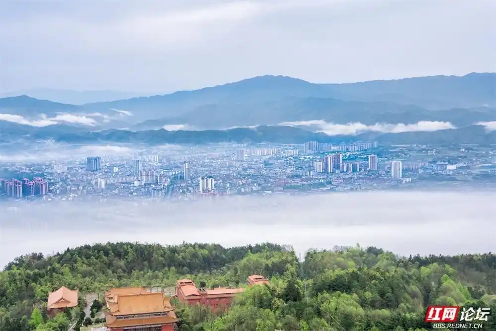 4月4日,怀化市靖州苗族侗族自治县飞山景区迎来春日云海盛景。云雾如绸带缠绕山峦,金顶古刹在云海间若隐若现;山下田园村落、城区楼宇与葱郁林海相映成趣,共同勾勒出一幅“山在云中走,城在画中浮”的诗意画卷。